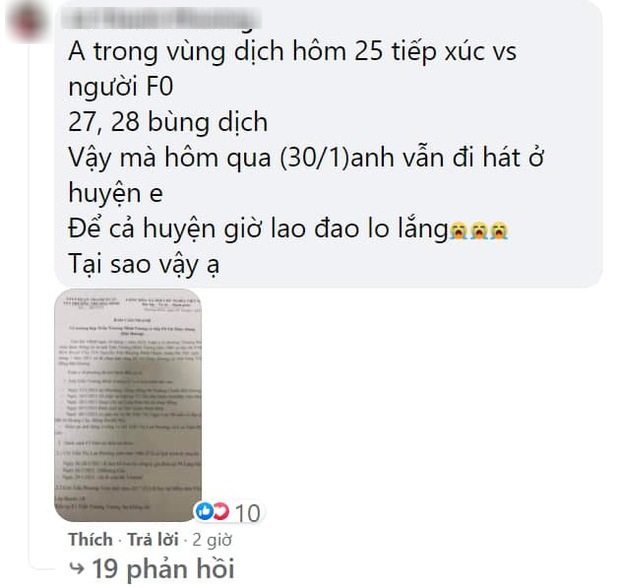 Tuy nhiên, trả lời với Pháp Luật & Bạn Đọc, giọng ca "Vệt nắng cuối trời" đã giải thích rõ ràng: "Tôi đi diễn ở Hải Dương vào ngày 25/1, sau đó có diễn ở Quốc Oai nữa. Cho đến tối ngày 30/1 tôi mới biết thông tin mình là F1. Buổi sáng ngày 30/1, tôi có đi đám cưới nhà bà con ở Ninh Bình chứ không phải đi diễn".