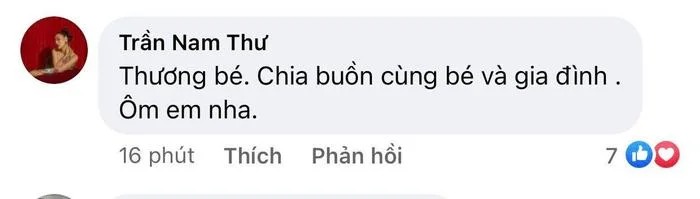 - Diễn viên Nam Thư động viên: "Thương bé. Chia buồn cùng bé và gia đình. Ôm em nhe".