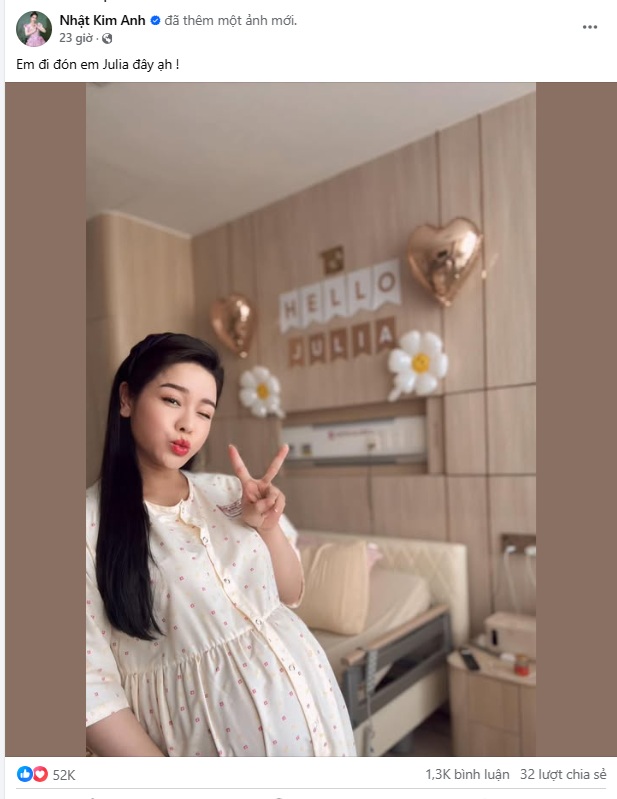 Sáng 17/1 trên trang cá nhân, diễn viên Nhật Kim Anh đăng tải bức ảnh chụp tại bệnh viện kèm chia sẻ: "Em đi đón Julia đây". Rất nhiều đồng nghiệp, khán giả gửi lời chúc mừng cô được "mẹ tròn con vuông".