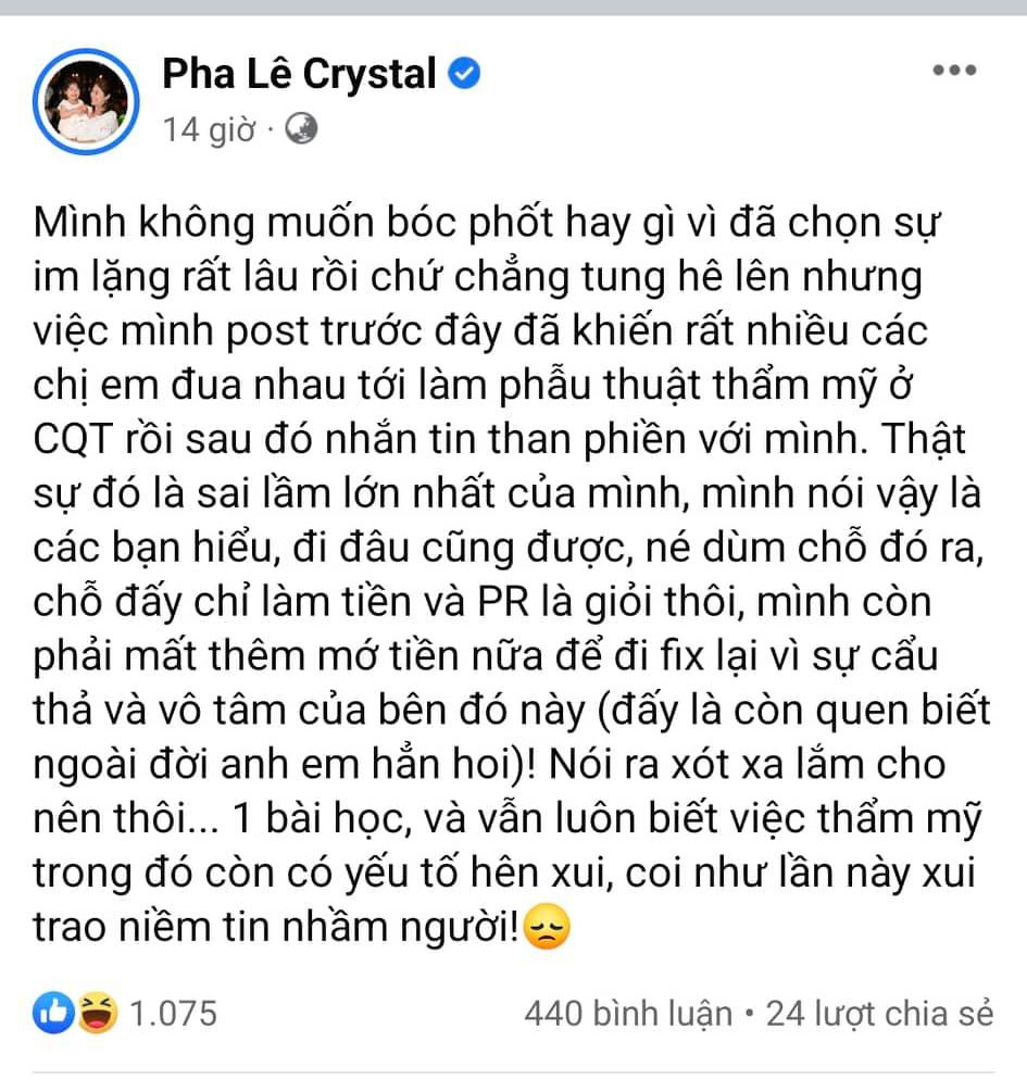 Mới đây, ca sĩ Pha Lê vừa lên tiếng kêu gọi mọi người né cơ sở thẩm mỹ viện của bác sĩ C.Q.T, đồng thời cho biết bên này chỉ giỏi PR và làm tiền.