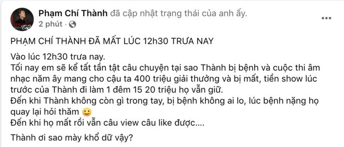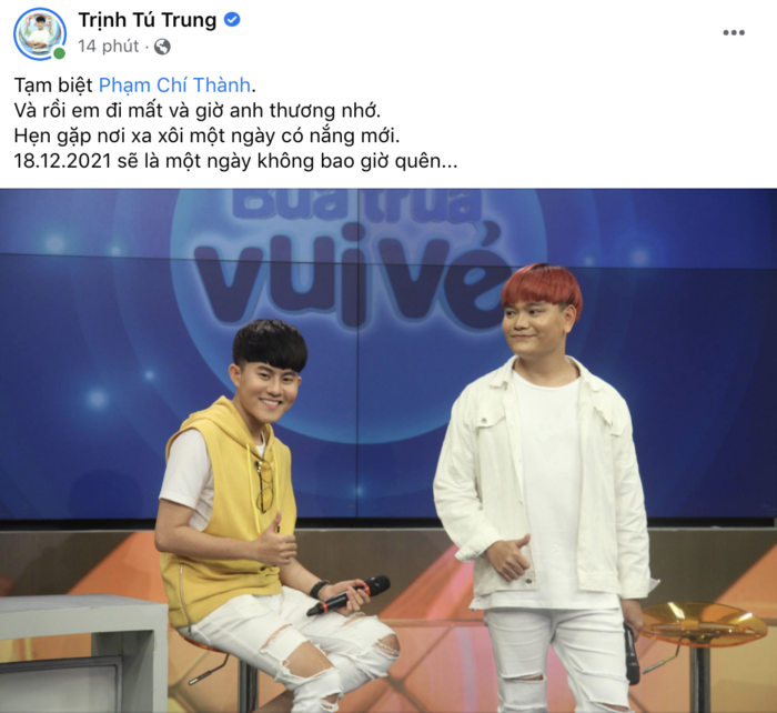 Cách đây ít phút, trên trang cá nhân, diễn viên Trịnh Tú Trung thông báo tin buồn, ca sĩ Phạm Chí Thành đã qua đời. Nam diễn viên nghẹn ngào: “Tạm biệt Phạm Chí Thành. Và rồi em đi mất và giờ anh thương nhớ. Hẹn gặp nơi xa xôi một ngày có nắng mới. 18/12/2021 sẽ là một ngày không bao giờ quên…”.
