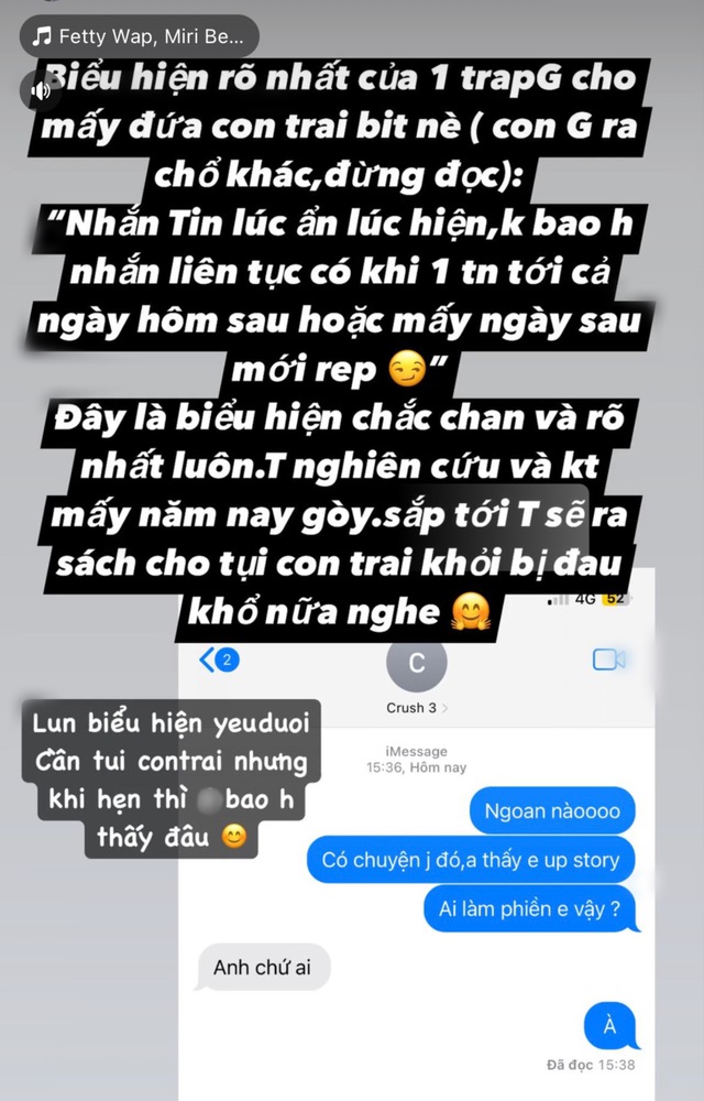 Vào ngày 9/5, ca sĩ Tim gây xôn xao khi chia sẻ đoạn tin nhắn trò chuyện tình cảm với một cô gái lạ được lưu với cái tên "crush 3". Tim đã hỏi thăm, bày tỏ sự quan tâm tới cảm xúc của người này: "Ngoan nào. Có chuyện gì đó, anh thấy em đăng story. Ai làm phiền em vậy". Đáng chú ý, anh còn tỏ thái độ với giọng điệu bức xúc, chỉ ra những biểu hiện của một trap girl.