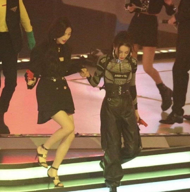 Hàng loạt blogger xứ Trung đang khiến MXH Weibo bùng nổ khi chia sẻ khoảnh khắc cực "soái" của Địch Lệ Nhiệt Ba tại sự kiện giới thiệu game mới đây. Trong hình, cô nàng dịu dàng cầm tay Dương Siêu Việt - người đang mặc váy ngắn và đi giày cao gót - đi xuống bậc cầu thang.