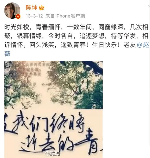 Nhưng mới đây, cư dân mạng phát hiện một người bạn thân khác của Triệu Vy là Trần Khôn lại không hề xóa những bài đăng liên quan đến cô trên trang Weibo cá nhân. Tuy Trần Khôn không tương tác nhiều với Triệu Vy như Huỳnh Hiểu Minh nhưng dân tình vẫn thấy một số bài đăng chúc mừng sinh nhật mà anh gửi cho nữ diễn viên Hoàn Châu cách cách. Cách hành xử này của Trần Khôn chẳng những không gây tranh cãi mà thậm chí còn nhận được lời khen ngợi.