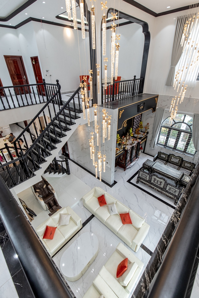 Không gian bên trong của căn biệt thự khiến nhiều người choáng ngợp bởi độ sang trọng, hoành tráng nhờ tông màu trắng - đen chủ đạo. Được biết đây cũng là hai màu sắc mà người đẹp yêu thích, giống với cơ ngơi của cô ở TP.HCM. Công trình được xây dựng theo phong cách hiện đại, khác hẳn với những kiểu nhà ở dưới quê.