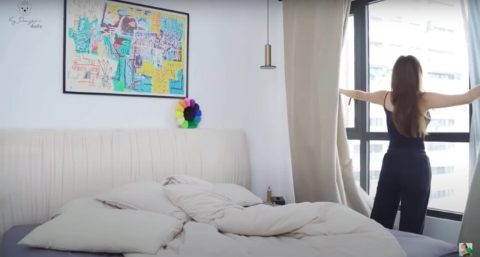Phòng ngủ của Kỳ Duyên có cửa sổ lớn đón nắng. Mỗi sáng thức dậy, cô thường dành thời gian tập yoa, hít thở sâu, nghe nhạc du dương để thư giãn cơ thể. Người đẹp trang trí nhà bằng nhiều bức tranh, cây cảnh.