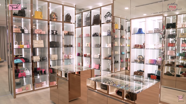 Điều khiến netizen thắc mắc ngay lúc này chính là căn phòng mà "nữ hoàng nội y" đặt những món đồ hiệu đắt đỏ. Có thể nói, Ngọc Trinh vốn nổi tiếng với thú vui shopping, tiêu tiền vào những thương hiệu xa xỉ nên góc để đồ của cô cũng hoành tráng không kém. "Nữ hoàng nội y" có một khu phòng ngủ triệu đô, chuyên để cả bộ sưu tập hàng hiệu sắp xếp gọn gàng trong căn biệt thự riêng. Đặc biệt, ngay góc bàn trang điểm chính là nơi bóng hồng để bộ sưu tập đồng hồ hiệu đếm sơ sơ đã tầm 14 cái. Trên những đoạn vlog tự chia sẻ trên YouTube, Ngọc Trinh không ngần ngại khoe ra những món đồ trị giá hàng tỷ đồng này.