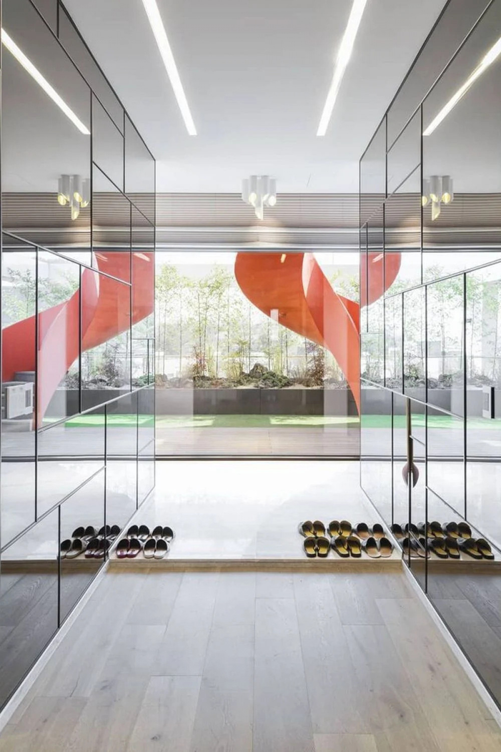 Cửa sổ kính trong suốt từ trần đến sàn và cửa sổ trần cho phép ánh sáng ban ngày tự nhiên tràn vào căn hộ, đồng thời tạo khung cảnh đẹp như tranh vẽ của đường chân trời Seoul. Bên cạnh phòng tắm riêng, phòng ngủ chính còn có tủ quần áo không cửa ngăn rộng rãi. Căn hộ áp mái của Hyun Bin cũng được thiết kế với một khu vườn riêng trên tầng mái, nơi hoàn hảo để tiếp khách.