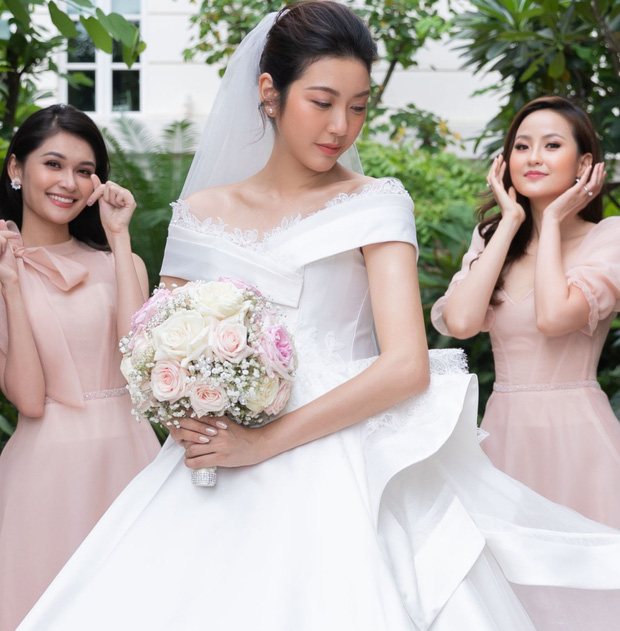 Và không để khán giả mòn mỏi chờ đợi thêm, mới đây, cô dâu mới Thuý Vân đã chính thức lộ diện. Trong chiếc váy trắng tinh khôi, Thuý Vân khoe trọn nhan sắc cực xinh đẹp ở tuổi 26. Mái tóc búi nhẹ kết hợp với kiểu make-up ngọt ngào giúp nàng Á hậu ngày hôm nay chạm tới nét cao sang mà vẫn vô cùng duyên dáng. Thuý Vân liên tục nở nụ cười rạng rỡ bên cạnh dàn phù dâu. Từ ánh mắt, nụ cười của nàng Á hậu đều diễn tả trọn vẹn niềm hạnh phúc của cô dâu mới.