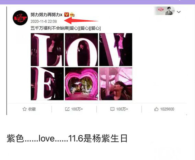 Không chỉ vậy, vào đúng ngày 6/11, trên Weibo, Lay bất ngờ đăng loạt bức ảnh chụp cùng chữ LOVE màu tím. Đáng chú ý, 6/11 là sinh nhật của Dương Tử, mà màu tím trong tiếng Trung chính là chữ Tử trong tên của nữ ca sĩ. Đây được cho là màn tỏ tình của Lay dành cho mỹ nhân Hương Mật Tựa Khói Sương đúng ngày sinh nhật.