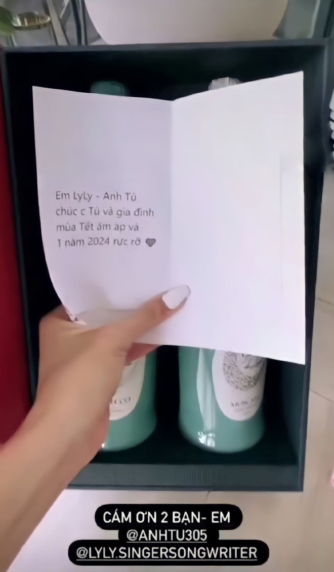 Theo đó, trong một bài đăng mà fanpage Anh Tú - LyLy đăng tải, người quen của cả hai đã nhận được hộp quà ngày Tết đính kèm lời chúc: "Em LyLy - Anh Tú chúc chị và gia đình mùa Tết ấm áp và 1 năm 2024 rực rỡ", "Em LyLy - Anh Tú chúc anh chị và gia đình năm mới 2024 nhiều sức khỏe, hạnh phúc và thành công...". Nhìn loạt ảnh mới, fan thích thú bình luận: "Hàng xóm là có thể gộp chung quà vậy sao ta, ồ vậy cũng tiện ha. Quà tuy hai mà một, tuy một mà hai?".