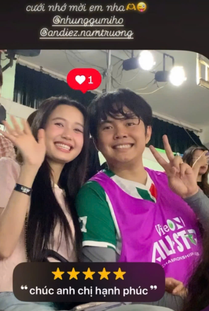 Chuyện tình ngọt ngào của cặp đôi này nhận được sự ủng hộ từ đông đảo cư dân mạng. Mới đây, Nhung Gumiho chia sẻ khoảnh khắc đi xem ông xã tương lai nhận giải thưởng tại Vie On All Star Championship. Ở story tiếp theo, nữ diễn viên sinh năm 1992 đăng tải bức hình của cặp đôi được một netizen chụp lại.
