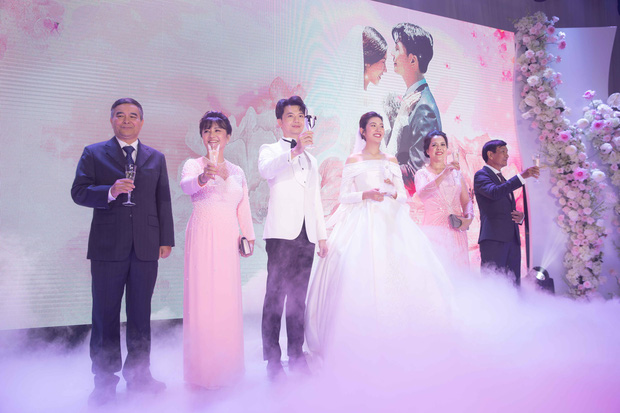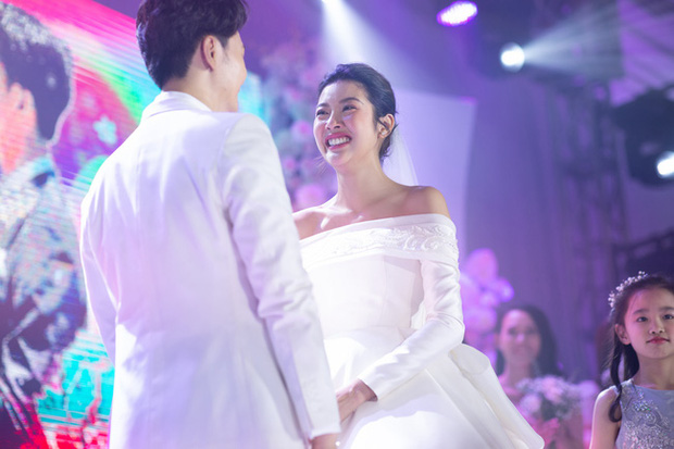 Nếu như không gian buổi tiệc được trang trí ngập hoa tươi đầy lộng lẫy, ví như "đám cưới cổ tích" thì giây phút cả hai nhìn nhau trìu mến, cùng nắm tay nhau cực tình tứ đã khiến đông đảo quan khách đều vô cùng xúc động. Giọt nước mắt đã rơi trên khuôn mặt của cả hai, những nụ cười, những ánh mắt đong đầy tình yêu cũng luôn thường trực. Lễ cưới diễn ra với loạt khoảnh khắc vừa xúc động, vừa lấp lánh như cổ tích.