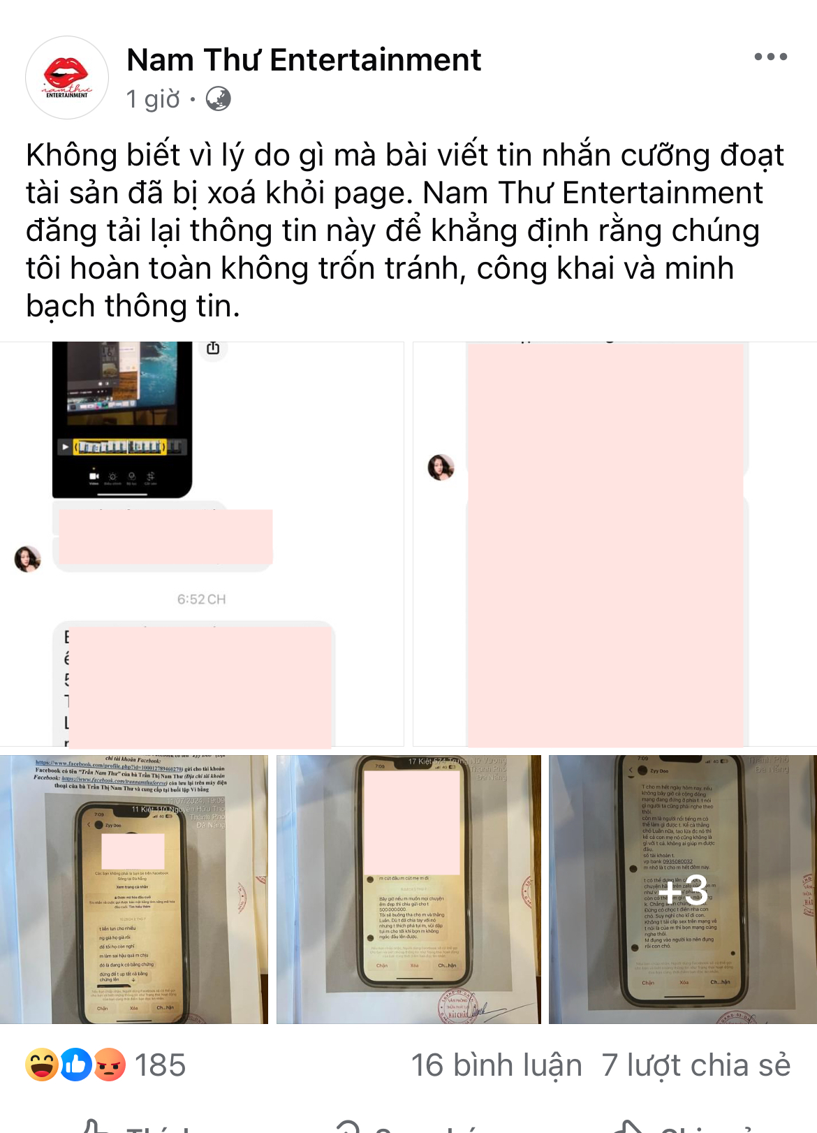Phía công ty Nam Thư nhấn mạnh: "Chúng tôi đăng tải lại thông tin này để khẳng định rằng chúng tôi hoàn toàn không trốn tránh, công khai và minh bạch thông tin". Tuy nhiên, đến sáng 13/8, bài đăng này tiếp tục biến mất.