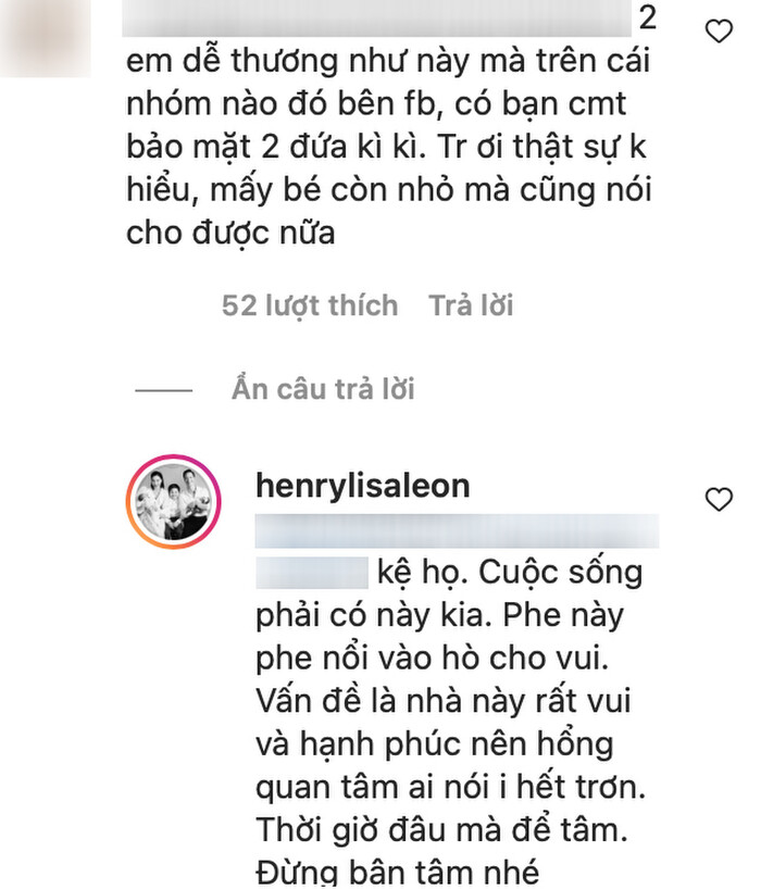 Trước phản ứng của phía Hà Hồ, nhiều người cũng để lại bình luận ủng hộ: "Nhiều người lớn mà nói mấy câu không chấp nhận được, phát ngôn bừa bãi thật sự", "Chung quy là vì họ ghen tị đó", "Mãi ủng hộ Hà và gia đình nhỏ"...