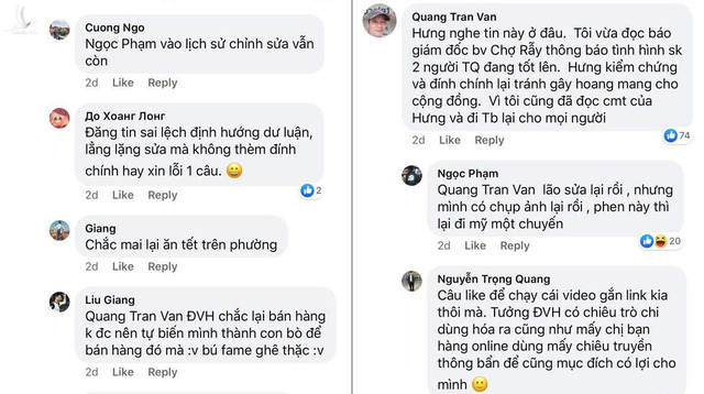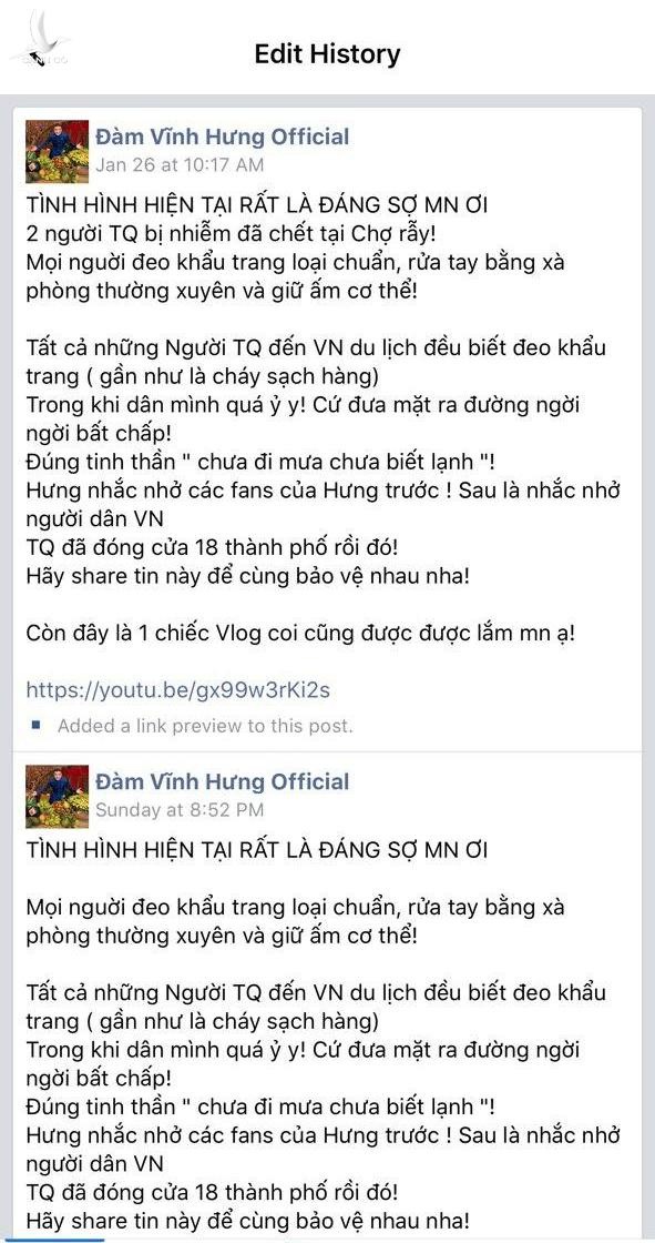 Trước đó, trên trang fanpage Đàm Vĩnh Hưng cũng chia sẻ một thông tin không đúng về thông tin hai bệnh nhân người Trung Quốc điều trị tại bệnh viện Chợ Rẫy. Theo trang này thì "2 người Trung Quốc bị nhiễm đã chết tại Chợ Rẫy".