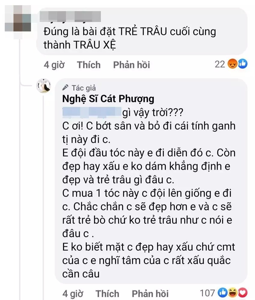 Trước lời lẽ kém duyên, Cát Phượng đáp trả sâu cay: "Gì vậy trời? Chị ơi, chị bớt sân si và bỏ đi cái tính ganh tỵ này đi. Em đội đầu tóc này đi diễn đó chị. Còn đẹp hay xấu, em không dám khẳng định em đẹp và trẻ trâu gì đâu chị.