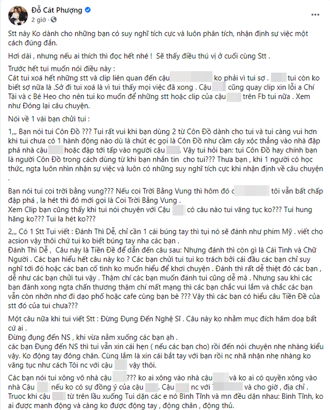 Trước phản ứng tiêu cực này, Cát Phượng đã lên tiếng phản hồi rõ ràng trên trang cá nhân. Cô khẳng định mình không hề có bất cứ hành động nào "côn đồ" như mọi người nói, không tỏ ra hung hăng, la hét hay văng tục. Cô cho biết những câu nói "đánh thì dễ, chỉ cần 1 cái búng tay thì tụi nó sẽ đánh như phim Mỹ", "đừng đụng đến nghệ sĩ" trong bài đăng trước của mình không mang ý nghĩa tiêu cực như nhiều người suy luận, và cũng không hăm dọa bất kỳ ai. Nữ diễn viên nhấn mạnh mình xóa toàn bộ những bài viết liên quan đến lùm xùm này vì mọi chuyện đã được giải quyết xong xuôi chứ không phải vì cô sợ hãi.