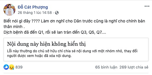 Trước đó, vào hôm 26/1, khi báo chí đưa tin về việc phát hiện 2 ca nhiễm virus corona ở bệnh viện Chợ Rẫy, TP.HCM, nữ diễn viên viết trên trang cá nhân: "Biết nói gì đây? Làm ơn nghĩ cho dân trước cũng là nghĩ cho chính bản thân mình. Dịch bệnh đã đến quận một, rồi sẽ lan tràn đến quận 3, quận 5, quận 7".