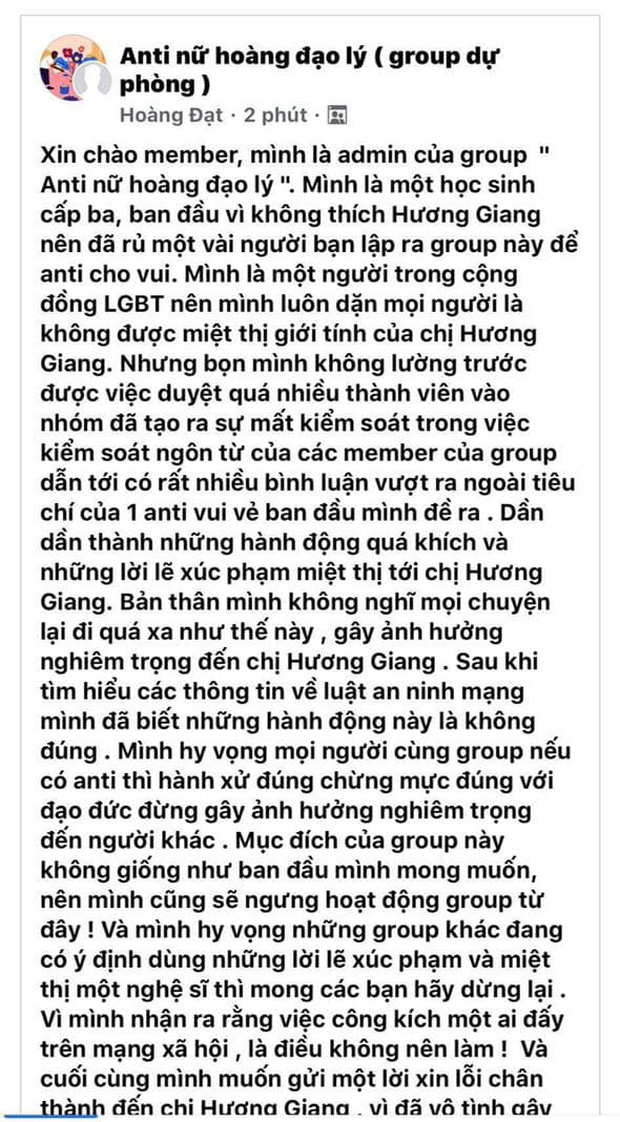 Spotlight tối ngày 31/10 chắc chắn thuộc về clip dài gần 18 phút của nữ ca sĩ Hương Giang. Trong suốt đoạn clip, Hương Giang đã mang đến câu chuyện về một nữ nghệ sĩ dũng cảm đối mặt với chính antifan của mình. Sau khi đoạn clip lên sóng, không chỉ nhân vật chính trong cuộc trò chuyện mà dường như cả admin của group anti Hương Giang cũng được "cảm hóa". Bằng chứng là mới đây, người này đã quyết định sẽ xóa group và gửi lời xin lỗi chân thành đến Hương Giang.