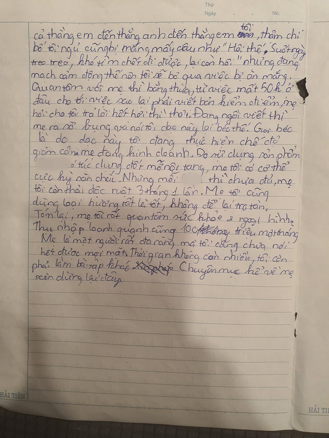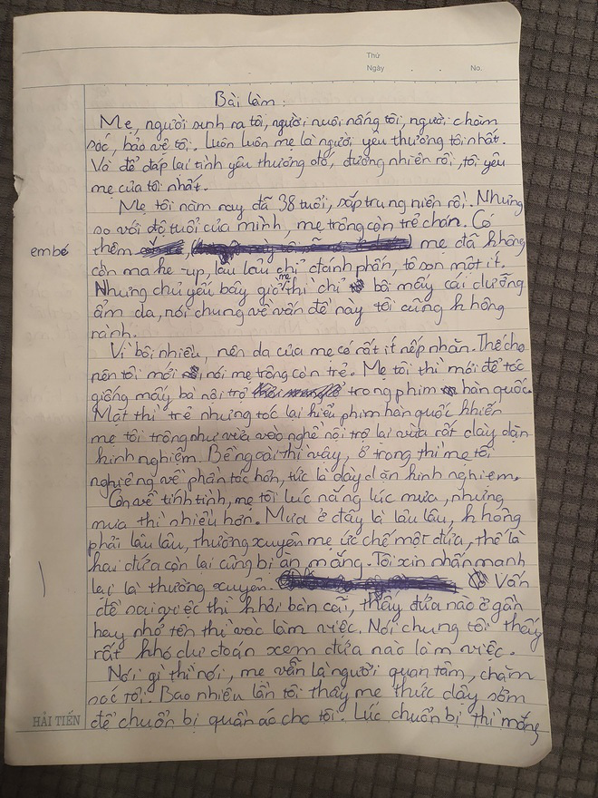 Con trai Xuân Bắc miêu tả mẹ trong bài tập làm văn: "Mẹ người sinh ra tôi, người nuôi sống tôi, người chăm sóc bảo vệ tôi, luôn luôn mẹ là người yêu thương tôi nhất. Và để đáp lại tình yêu đó, đương nhiên tôi yêu mẹ của tôi nhất.