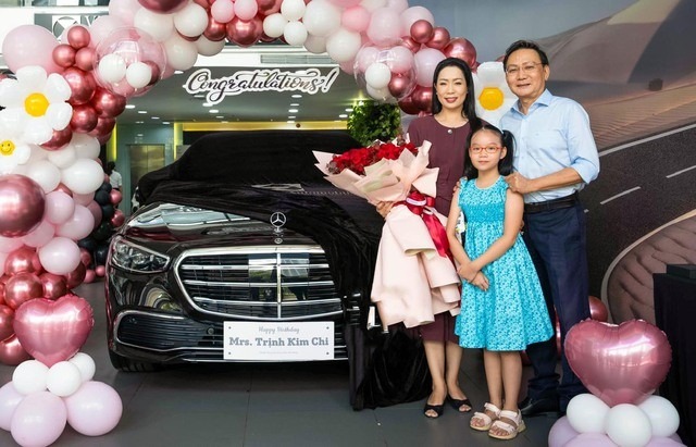 Trên trang cá nhân, Trịnh Kim Chi cũng đăng ảnh đến cửa hàng làm lễ nhận xe cùng ông xã và con gái. Bạn đời nữ diễn viên còn chu đáo nhờ người trang trí và chuẩn bị hoa, bánh kem để chúc mừng cô.