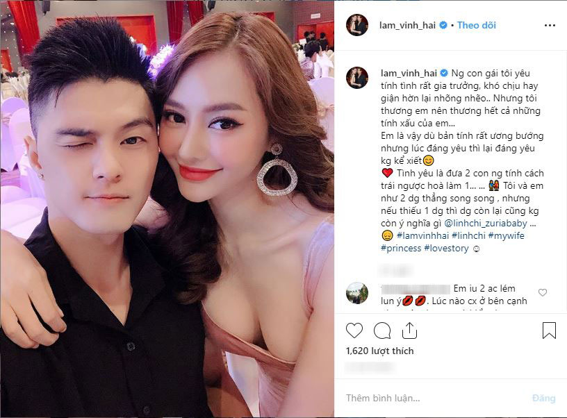 Từ khi chính thức công khai ở bên nhau, Linh Chi và Lâm Vinh Hải luôn rất thoải mái trong việc thể hiện tình cảm trên mạng xã hội hay nơi công cộng. Thế nhưng trong khi Linh Chi thường xuyên nhắn nhủ lời ngọt ngào đến bạn trai trên trang cá nhân thì Lâm Vinh Hải có vẻ như khá kiệm lời.