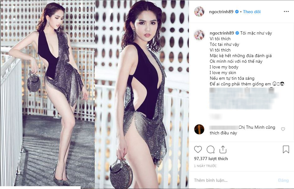Trên trang cá nhân, "nữ hoàng nội y" không ngần ngại đăng những bức hình gây tranh cãi của mình kèm dòng chú thích như một lời tuyên chiến: "Tôi mặc như vậy. Vì tôi thích. Tóc tai như vậy. Vì tôi thích. Mặc kệ hết những đứa đánh giá. Ok mình nói với nó thế này. I love my body. I love my skin. Nếu em tự tin tỏa sáng. Để ai cũng phải thèm giống em".