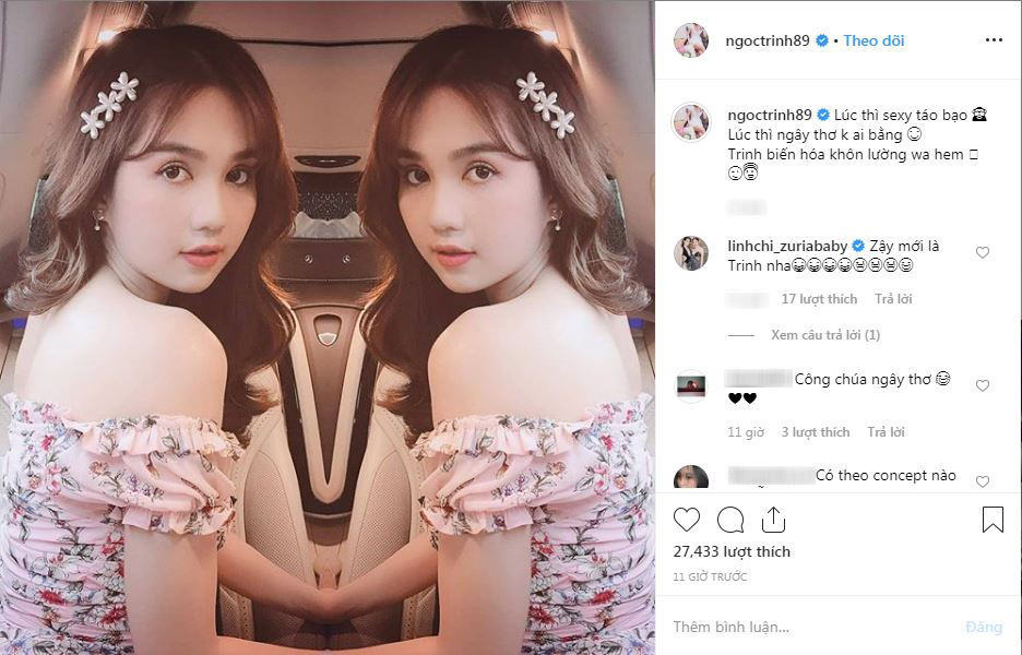 Không dừng lại ở đó, cách đây ít giờ, người đẹp tiếp tục đăng tải bức ảnh khác với phong cách thay đổi 180 độ: "Lúc thì sexy táo bạo, lúc thì ngây thơ không ai bằng. Trinh biến hóa khôn lường quá không".