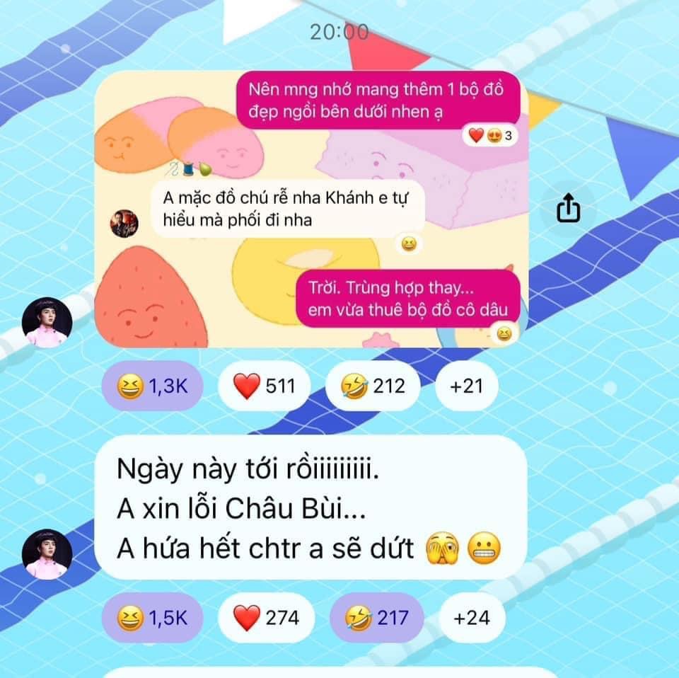 Mới đây nhất, Châu Bùi đã phải ra mặt "cảnh cáo" khi phát hiện ra "ý đồ" của Duy Khánh đối với Binz. Theo đó, khi dàn nghệ sĩ dặn dò nhau chuẩn bị trang phục, Binz cho biết sẽ diện như chú rể thì Duy Khánh liền đáp lại "Trời, trùng hợp thay em vừa thuê bộ đồ cô dâu". Ngay sau khi phát hiện ra tin nhắn này của Binz và Duy Khánh được chia sẻ trong nhóm fan, Châu Bùi đã đăng bức ảnh như diện váy cưới và nhấn mạnh: "Duy Khánh, thấy bảo em mới thuê bộ đồ cô dâu rồi". Cuộc đấu khẩu này đúng là "49 gặp 50", Duy Khánh chẳng chịu thua và còn hứa hẹn chiến tiếp với "chính thất" của Binz.