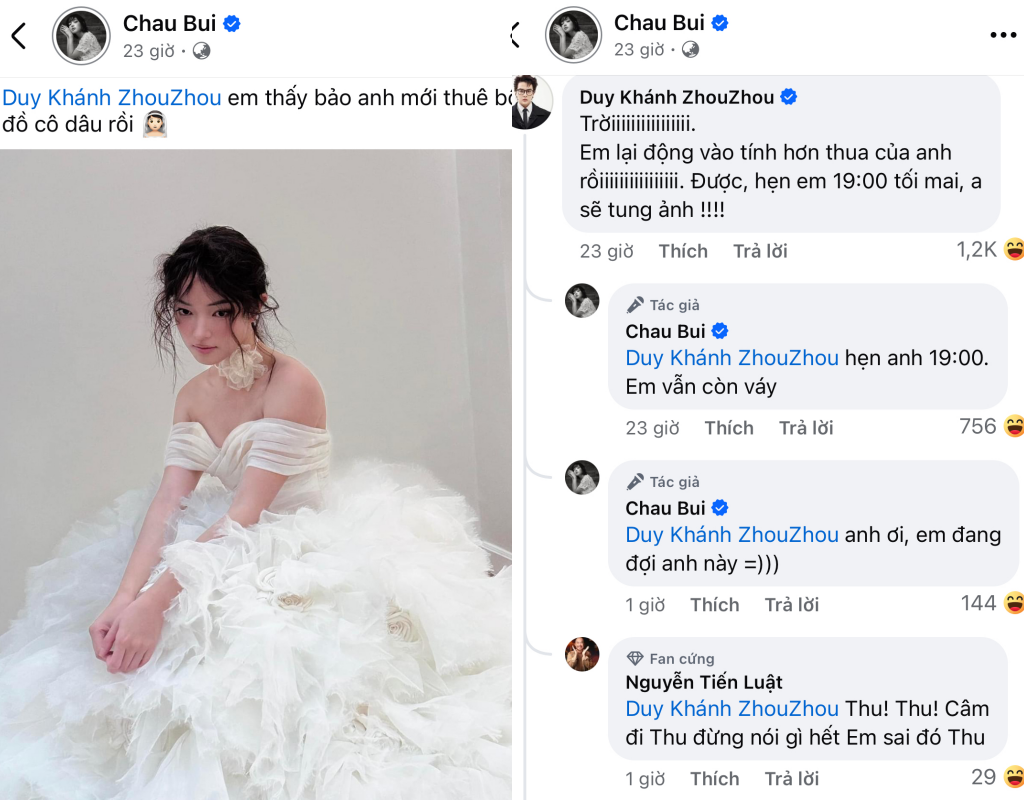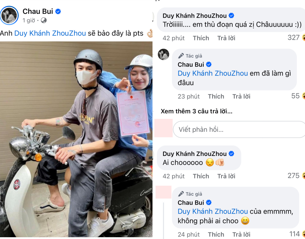 Đến tối 6/9, Châu Bùi gây bất ngờ khi đăng bức ảnh cùng Binz cầm một tờ giấy đăng ký kết hôn để "cà khịa" Duy Khánh. Tuy nhiên, nhìn qua cũng biết đây là sản phẩm photoshop dựa trên bức ảnh gốc của Diệu Nhi và Anh Tú gây bão mạng xã hội, thu về triệu tương tác cách đây 2 năm.
