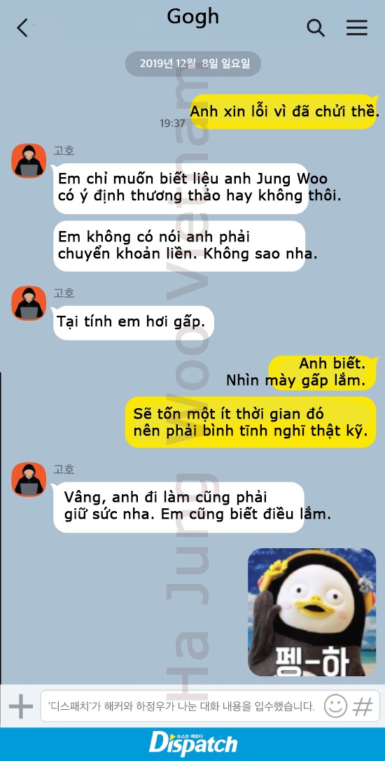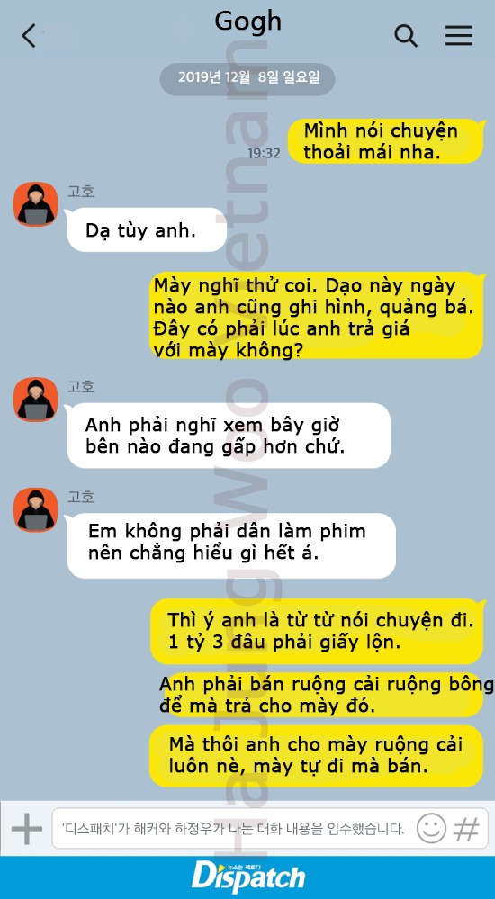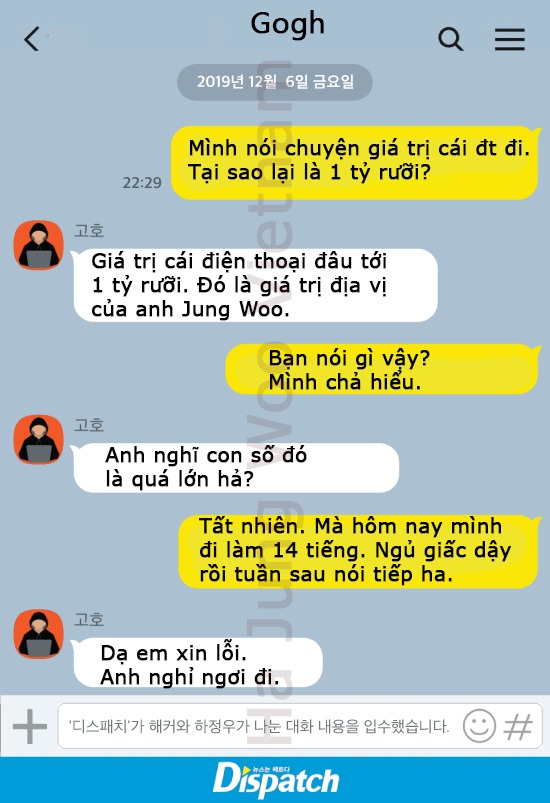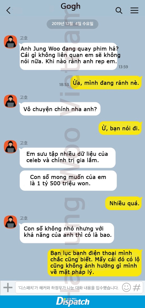 Cụ thể, hacker đã đòi Ha Jung Woo số tiền 1,5 tỷ won (gần 29 tỷ đồng) để để giữ kín toàn bộ thông tin cá nhân mà hắn đánh cắp được từ điện thoại của nam tài tử. Tuy nhiên, qua những dòng tin nhắn, có thể thấy Ha Jung Woo không hề tỏ ra mất bình tĩnh mà luôn giữ thái độ lịch sự, thậm chí có phần "lầy lội" khi tìm cách kéo dài thời gian trả tiền. Một điều nữa khiến dân tình không thể nhịn được cười là thái độ của tên hacker không hề giống một kẻ xấu đang tống tiền người khác chút nào mà luôn xưng hô rất lễ phép với Ha Jung Woo, thậm chí còn dặn dò nam diễn viên phải giữ gìn sức khỏe và chờ đợi anh hoàn thành công việc mới nhắn tin.