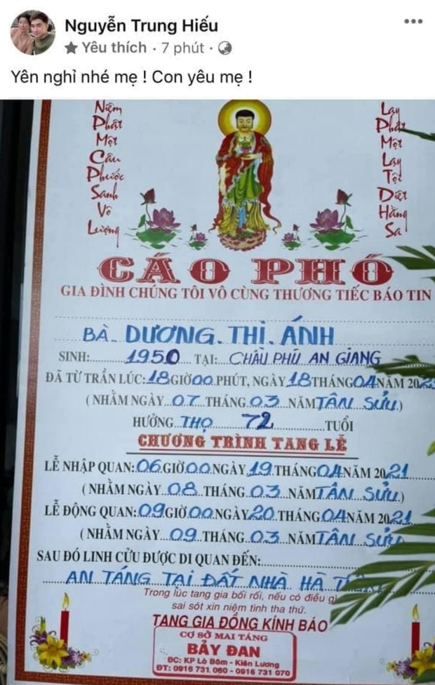 "Yên nghỉ nhé mẹ! Con yêu mẹ!", lời nhắn nhủ nam ca sĩ đính kèm theo cáo phó khiến nhiều người xúc động mạnh. Theo đó, lễ nhập quan của mẹ Chi Dân diễn ra vào sáng hôm nay tại quê nhà ở Châu Phú, An Giang. Linh cữu bà sẽ được an táng vào ngày mai (20/4). Được biết, mẹ luôn là người bên cạnh và ủng hộ Chi Dân trong mọi quyết định, góp phần quan trọng trong thành công của nam ca sĩ ngày hôm nay.