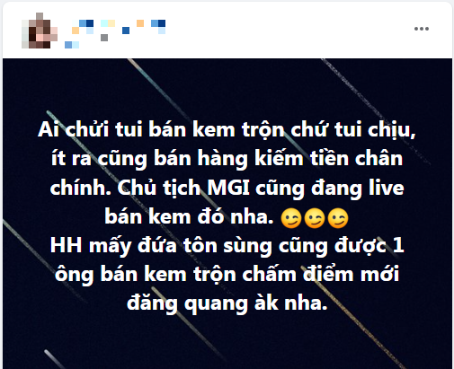 Mới đây, chị gái Hoa hậu Đặng Thu Thảo đăng đàn bức xúc vì bị netizen tràn vào chửi bán kem trộn. Cô nhắn nhủ cực căng: "Ai chửi tui bán kem trộn chứ tui chịu, ít ra cũng bán hàng kiếm tiền chân chính. Chủ tịch Miss Grand International cũng đang live bán kem đó nha. Hoa hậu mấy đứa tôn sùng cũng được 1 ông bán kem trộn chấm điểm mới đăng quang à nha".