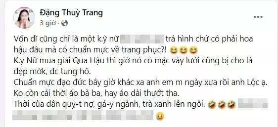 "Vốn dĩ cũng chỉ là một kỹ nữ trá hình chứ có phải Hoa hậu đâu mà có chuẩn mực về trang phục? Kỹ nữ mua giải hoa hậu thì giờ nó có mặc váy lưới cũng bị cho là đẹp, được tung hô.