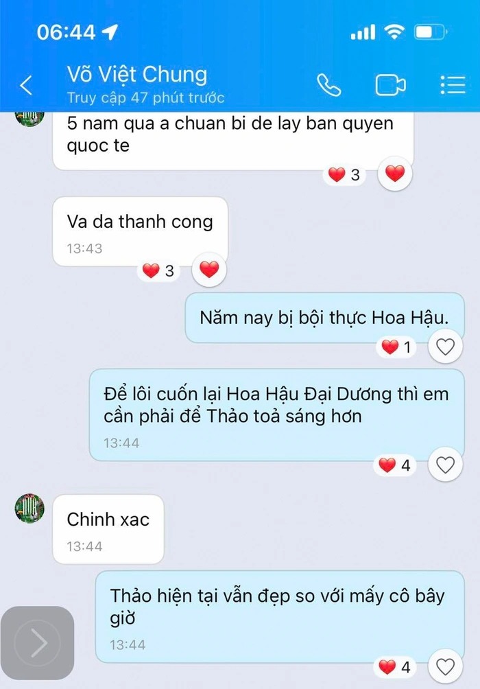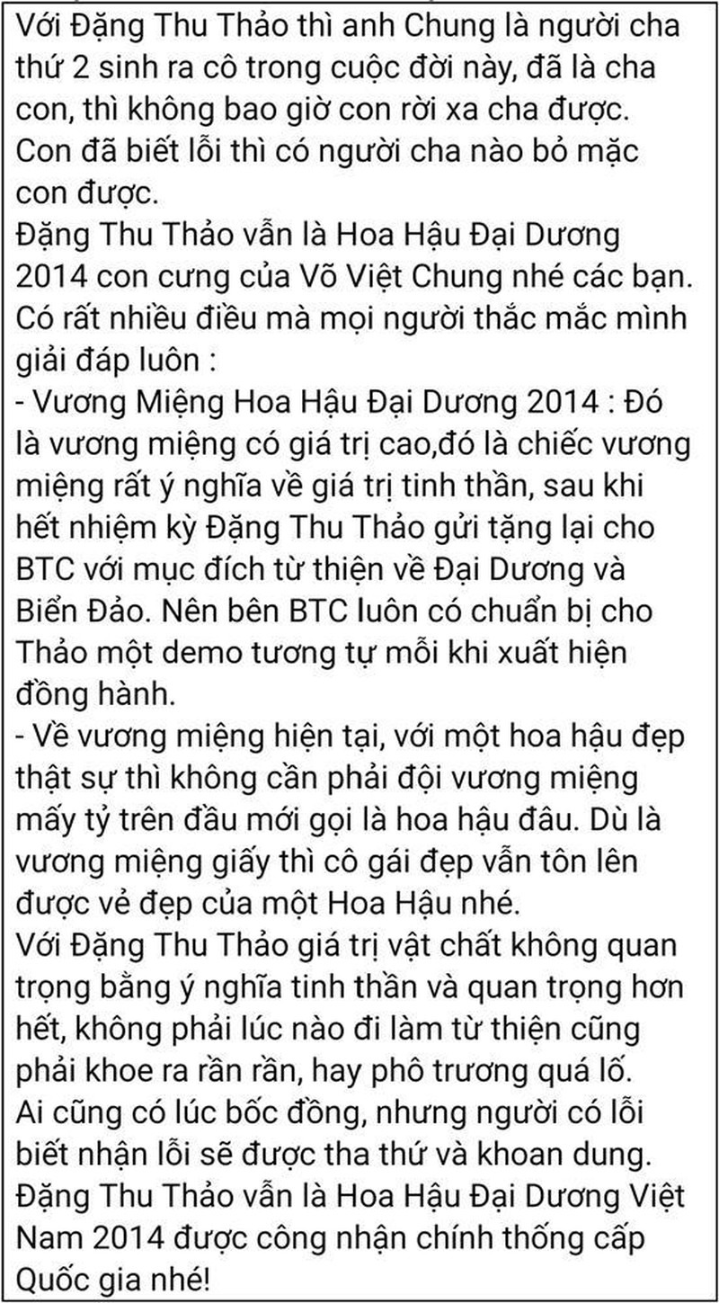 Mới đây, Đặng Thùy Trang - chị gái của Hoa hậu Đặng Thu Thảo vừa đăng tải đoạn tin nhắn với NTK Võ Việt Chung - nhà sáng lập cuộc thi Hoa hậu Đại dương và khẳng định em gái cô vẫn là Hoa hậu Đại dương 2014 dù có thế nào đi chăng nữa.