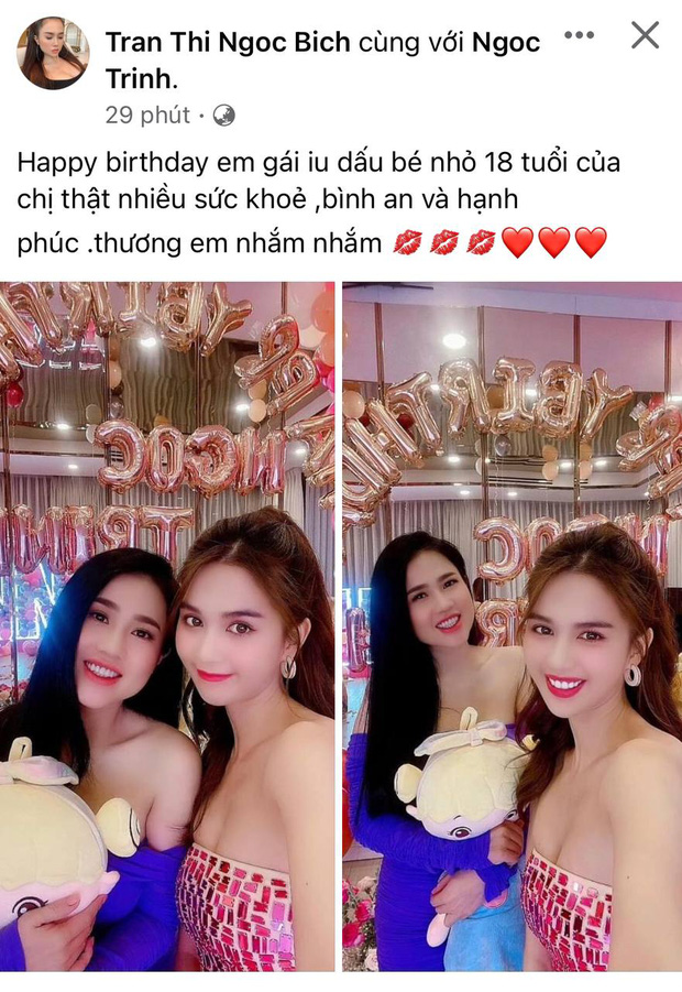 Sáng ngày 27/9, chị gái Ngọc Trinh bất ngờ đăng tải ảnh chụp cùng em gái để chúc mừng sinh nhật. Trên trang cá nhân, cô viết: "Happy birthday em gái yêu dấu bé nhỏ 18 tuổi của chị thật nhiều sức khoẻ, bình an và hạnh phúc. Thương em nhắm nhắm".