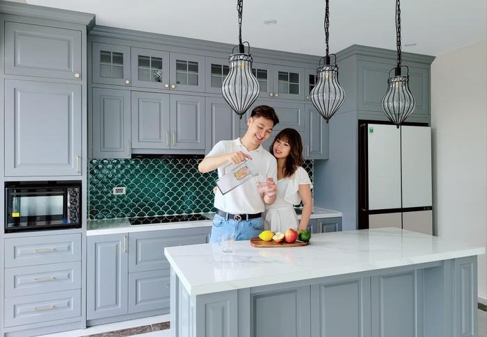 Mới đây, trên trang cá nhân bà xã Mạnh Trường đăng tải khoảnh khắc "tình bể bình" bên chồng. Đáng chú ý, không gian bếp với thiết kế sang - xịn - mịn khiến dân tình không khỏi trầm trồ. Cô viết: "Ấp ủ nhiều món ngon tại căn bếp nhỏ xinh này". Mạnh Trường liền để lại bình luận: "Mình lại vất vả tại căn bếp nhỏ xinh này, cụ thể là vị trí chậu rửa bát". Vợ nam diễn viên hài hước đáp: "Máy chạy bằng cơm công nhận bền".