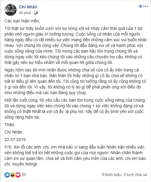 P/S: Xin lỗi các anh, chị, em nhà báo vì sáng đầu tuần Nhân bận nhiều việc nên không thể trả lời hết những cuộc gọi của mọi người. Nhân chân thành cám ơn sự quan tâm, chia sẻ và tình cảm yêu mến của các anh, chị em báo chí, truyền thông!"