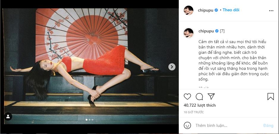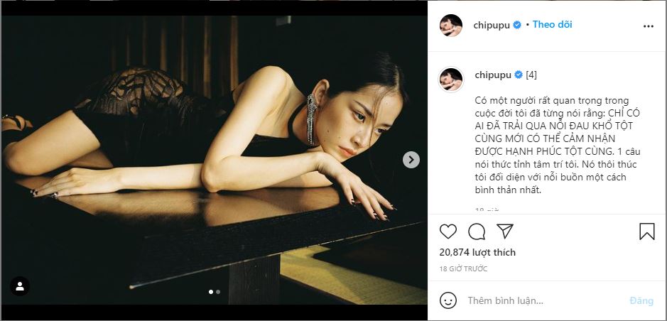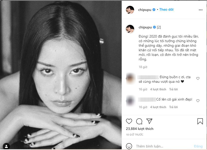 Mới đây, Chi Pu vừa gây chú ý khi đăng tải loạt ảnh mới với phong cách sexy, táo bạo lên Instagram cá nhân, kèm theo đó là một chuỗi status giãi bày tâm sự của cô nàng về năm 2020 vừa qua. Đây cũng là những lời tự an ủi mà Chi Pu muốn gửi gắm đến chính mình, sau hàng loạt những thị phi mà cô nàng đã gặp phải trong năm cũ, từ chuyện nghỉ chơi với người bạn thân 10 năm Quỳnh Anh Shyn vì nghi vấn yêu bạn trai cũ của bạn, cho đến việc bị tẩy chay, phản đối trên diện rộng khi xuất hiện trước công chúng với vai trò ca sĩ.