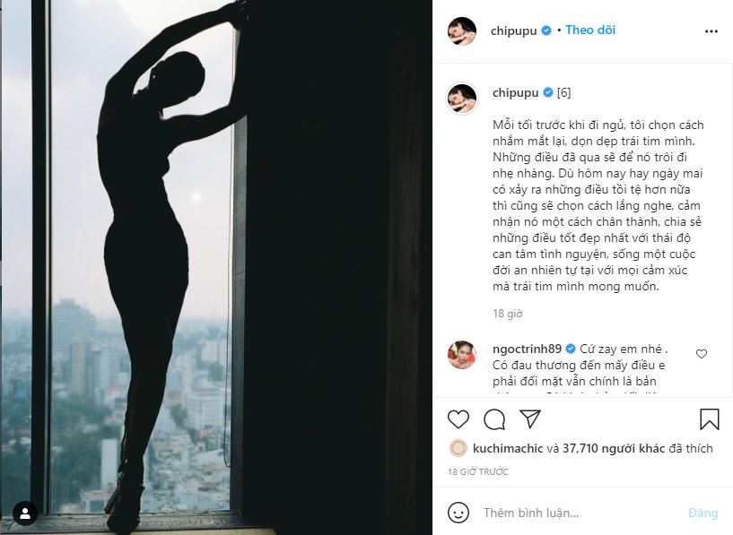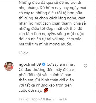 Trước những lời bộc bạch này của cô em thân thiết, "nữ hoàng nội y" Ngọc Trinh đã nhanh chóng vào bình luận động viên: "Cứ vậy em nhé. Có đau thương đến mấy điều em phải đối mặt vẫn chính là bản thân em. Cứ bình thản đối diện với tất cả những xáo trộn trên cuộc đời này".