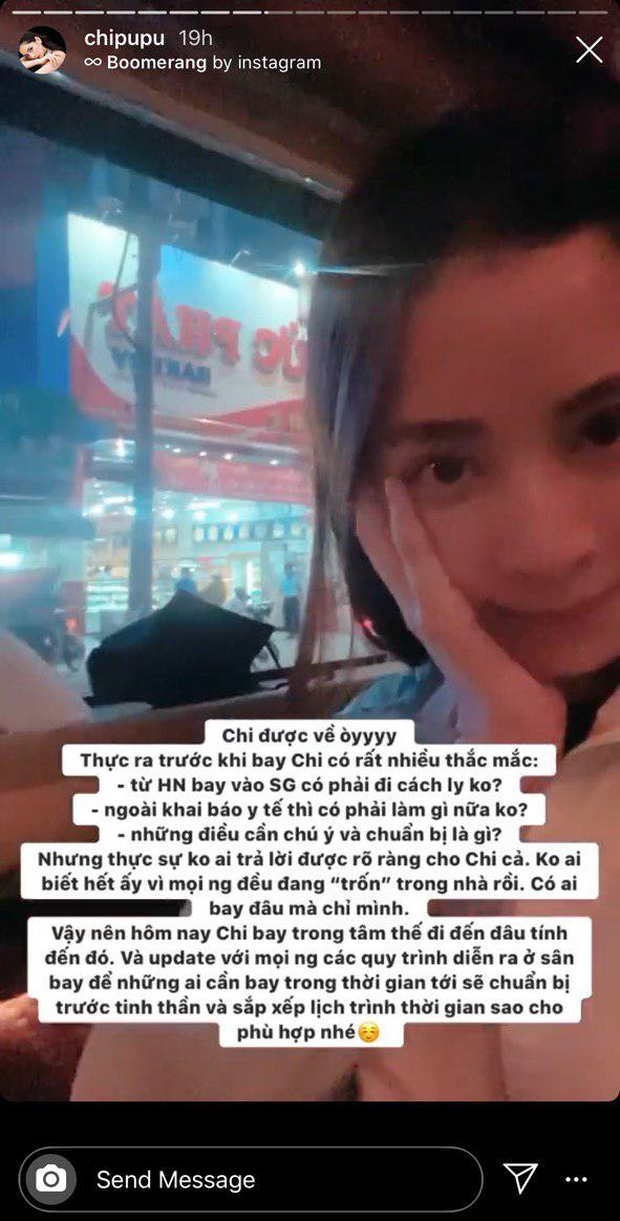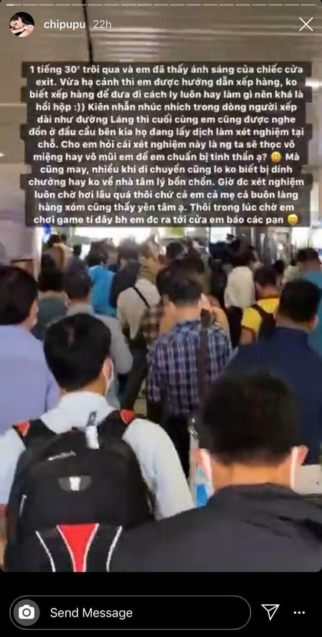 Và ngày 16/4 vừa qua, Chi Pu đã trực tiếp trải nghiệm cũng như có câu trả lời cho những thắc mắc này khi đáp chuyến bay từ Hà Nội đến TP.HCM. Được biết chuyến bay khởi hành từ Hà Nội lúc 13h nhưng phải đến 19h, cô nàng mới có thể rời sân bay về nhà. Lý do chủ yếu là bởi nữ ca sĩ đã mất gần 4 tiếng đồng hồ để xếp hàng, kiểm tra và xét nghiệm Covid-19 ngay tại sân bay Tân Sơn Nhất.