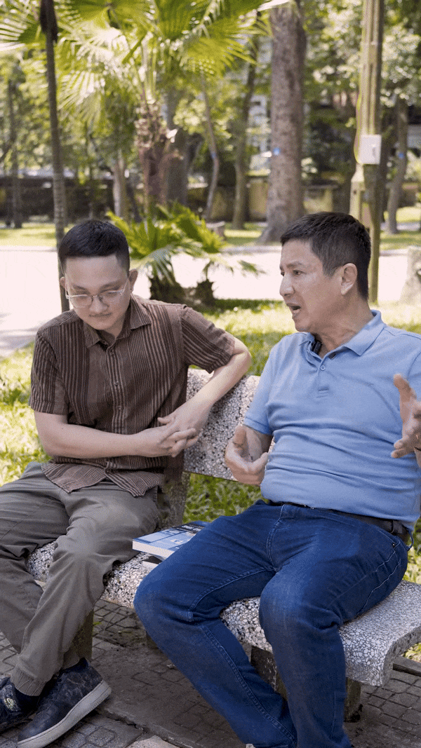 Sau đó, Chí Trung hỏi con trai: "Người ta nói với bố: Anh là nghệ sĩ, cũng tạm gọi là nổi tiếng, sao con trai lại không theo nghệ thuật, mà đi làm dịch giả?".