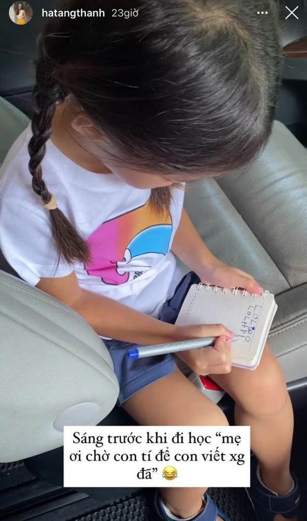 Theo đó, Hà Tăng đã đăng tải lên Instagram hình ảnh bé Chloe khi được mẹ đưa đi học buổi sáng. Mặc dù đã lên xe nhưng cô bé vẫn chưa muốn rời đi, xin mẹ chờ thêm một chút chỉ để viết nốt vài dòng chữ. "Sáng trước khi đi học: 'Mẹ ơi chờ con tí, để con viết xong đã'", nữ diễn viên chia sẻ. Khoảnh khắc này khiến nhiều người xem có chút ngạc nhiên bởi bé Chloe dù mới 3 tuổi nhưng đã nhận diện được mặt chữ, biết ghép từ để thành 1 câu hoàn chỉnh, đồng thời lại có tinh thần hiếu học đến thế. Cư dân mạng cũng dành nhiều lời khích lệ cho con gái "ngọc nữ", nhận định đây không phải điều mà đứa trẻ nào cũng làm được. "3 tuổi mà viết lách thế này là tốt rồi!", "Bé còn nhỏ mà hiếu học quá", "Chắc sau này đi học cao lên sẽ chóng thành tài đây",... là lời ngợi khen mà netizen dành cho con gái Hà Tăng.