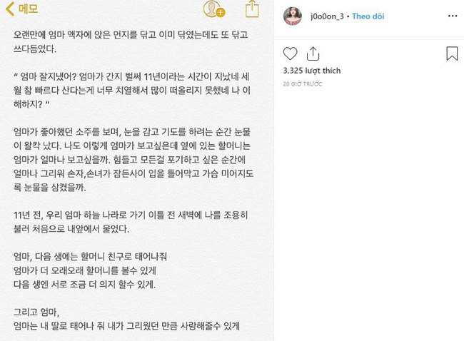 Choi Joon Hee chia sẻ: "Tôi đã lau những vết bụi mờ trên ảnh mẹ không biết bao nhiêu lần. 11 năm đã trôi qua, kể từ ngày mẹ tôi nói lời tạm biệt. Nhanh quá. Thời gian tàn nhẫn cuốn đi mọi điều, con đã không còn có thể nhớ tất cả về mẹ, mẹ có hiểu cho con không? Mỗi khi nhìn thấy món đồ uống yêu thích của mẹ, con không thể ngừng khóc khi nhắm mắt lại và cầu nguyện. Con nhớ mẹ rất nhiều, con muốn gặp mẹ bao nhiêu...