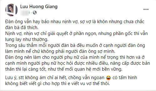 Mới đây, trên trang cá nhân, Lưu Hương Giang vừa bất ngờ đăng tải bài viết chia sẻ quan điểm về mối quan hệ giữa vợ và chồng. Cô viết: "Đàn ông vẫn hay bảo nhau nịnh vợ, sợ vợ là khôn nhưng chưa chắc đàn bà đã thích. Nịnh vợ, nhịn vợ chỉ giải quyết ở phần ngọn, nhưng phần gốc thì vẫn lung lay như thường. Trong sâu thẳm mỗi người đàn bà đều muốn ở cạnh người đàn ông làm mình nể chứ không phải người đàn ông sợ mình. Đàn ông nên làm cho người phụ nữ của mình nể trọng thì hơn và ở cạnh mình người phụ nữ học hỏi được nhiều điều, nâng cấp được bản thân thì lại càng tốt, như thế mối quan hệ mới bền vững".