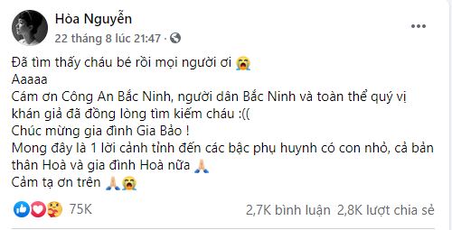 "Đã tìm thấy cháu bé rồi mọi người ơi! Cám ơn Công An Bắc Ninh, người dân Bắc Ninh và toàn thể quý vị khán giả đã đồng lòng tìm kiếm cháu. Chúc mừng gia đình Gia Bảo! Mong đây là 1 lời cảnh tỉnh đến các bậc phụ huynh có con nhỏ, cả bản thân Hòa và gia đình Hòa nữa. Cảm tạ ơn trên", Hòa Minzy viết.