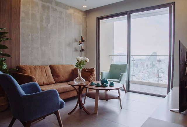Căn hộ này rộng khoảng 91m2, gồm 2 phòng ngủ, một phòng bếp và một phòng khách. Nội thất bên trong mang phong cách tối giản, toát lên vẻ đẹp vừa hiện đại vừa mộc mạc. Bao trùm cả căn hộ là màu xám của bê tông, màu nâu của gỗ, màu xanh của cây lá và một chút xanh dương mát mẻ.