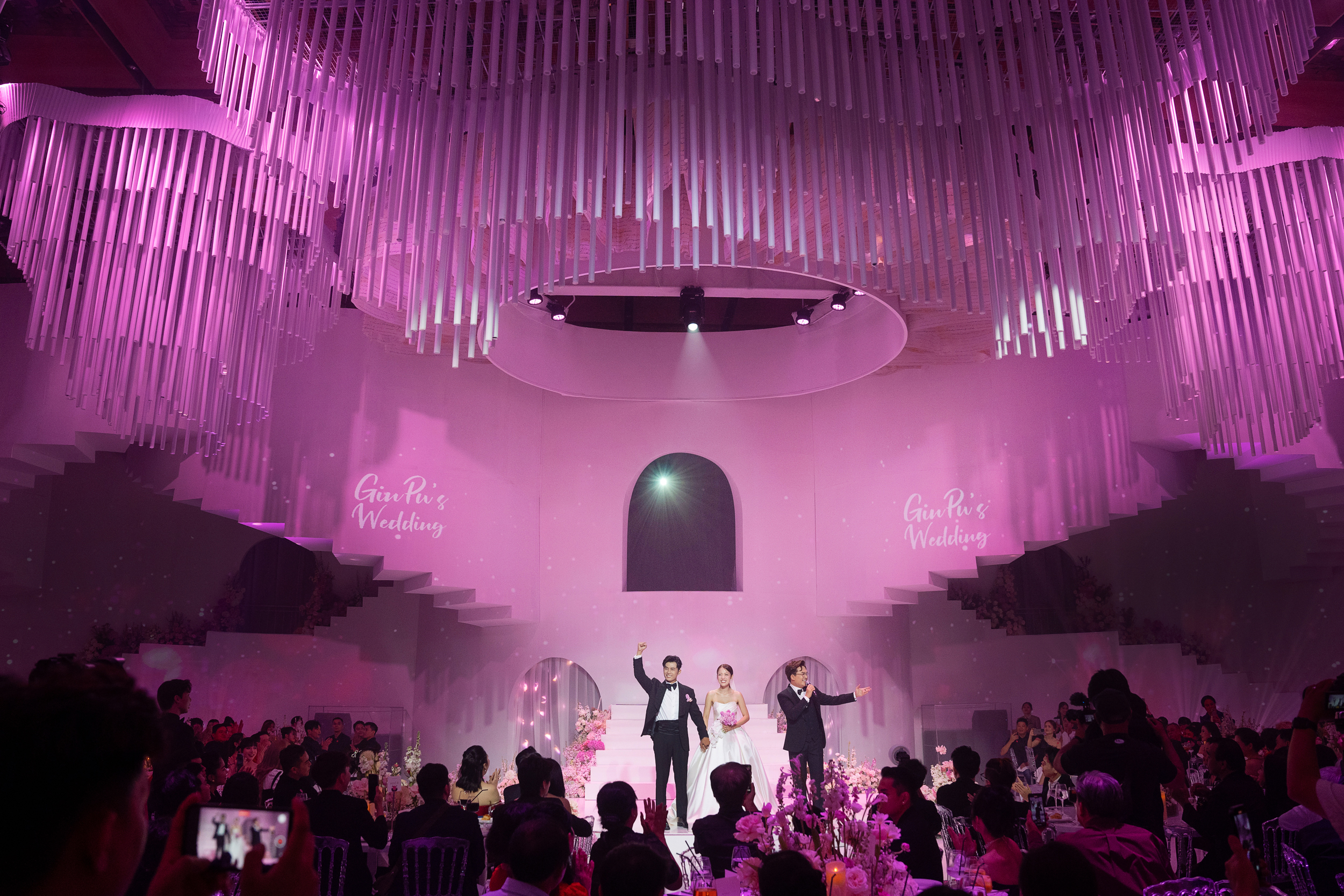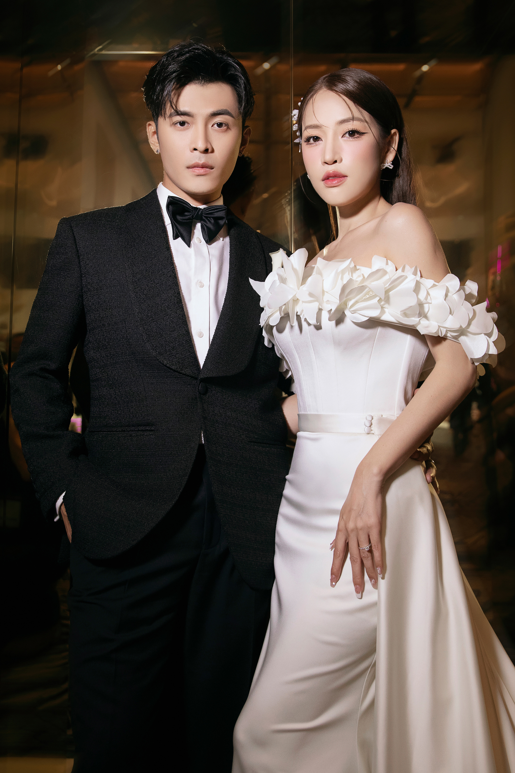 Tất nhiên, cặp đôi cô dâu chú rể cũng không vì thế mà lu mờ. Ngược lại, Gin Tuấn Kiệt và Puka còn rạng ngời hơn nhiều với nhan sắc tươi tắn cũng những bộ lễ phục bắt mắt. Nếu như chú rể khoe vẻ ngoài điển trai, phong độ trong trang phục áo vest thì cô dâu lại diện trang phục cúp ngực khoe vai trần trong váy cưới được đính kết tỉ mỉ, cầu kì.