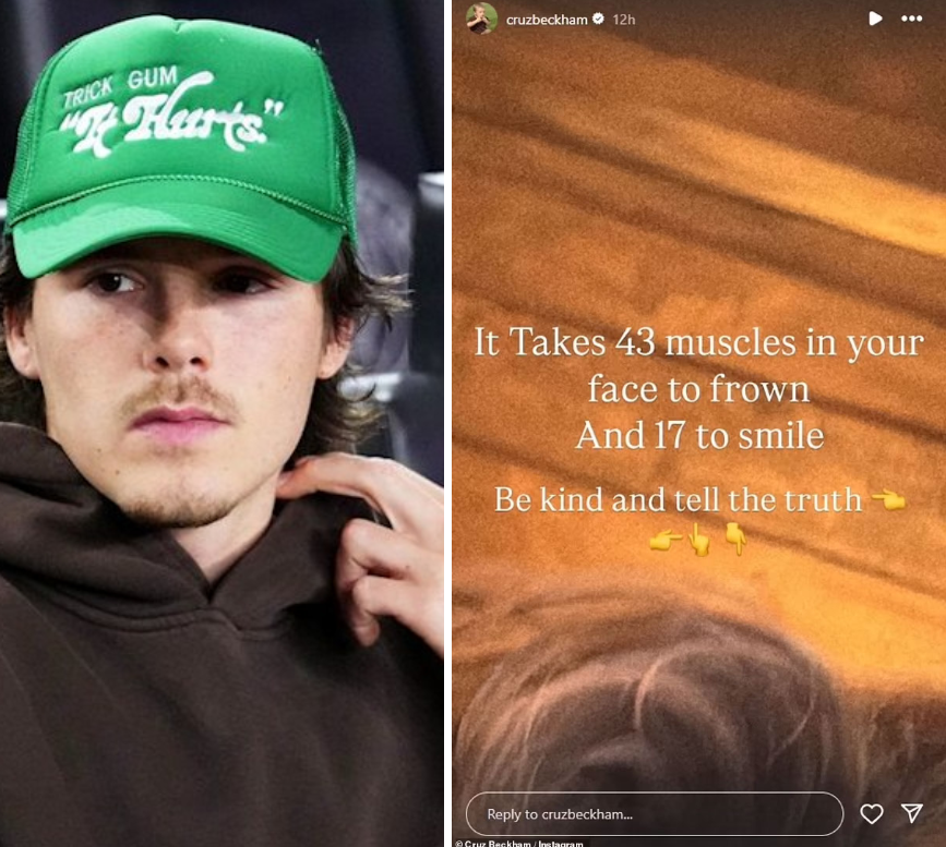 Về phần gia đình Beckham, con trai út Cruz là nhân vật cũng đưa ra story ẩn ý vào thời điểm ồn ào. Trên trang cá nhân, Cruz Beckham đăng thông điệp: "Cần 43 cơ mặt để cau mày và chỉ 17 cơ để mỉm cười", "Hãy tử tế và nói sự thật". Em trai Brooklyn Beckham còn đăng cùng một loạt biểu tượng cảm xúc chỉ tay như nhấn mạnh thêm thông điệp. Động thái của những "nhân vật phụ" trong ồn ào này càng khiến tình hình thêm căng thẳng.